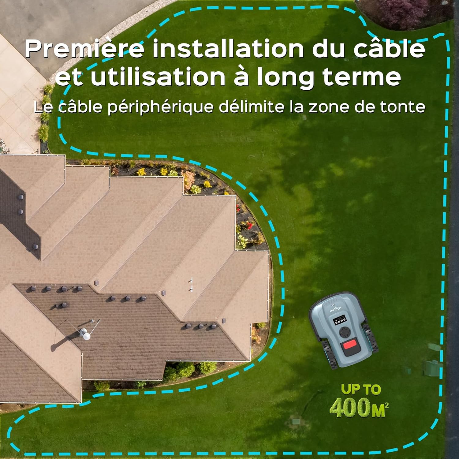 Entretien efficace de la pelouse:Lorsque la batterie atteint environ 20 %, le tondeuses robot retourne automatiquement à la station de charge en utilisant le câble périphérique installé. Le câble périphérique de 100 mètres inclus permet de délimiter rapidement et précisément la zone de coupe. Le E400 garde votre pelouse toujours propre et bien entretenue