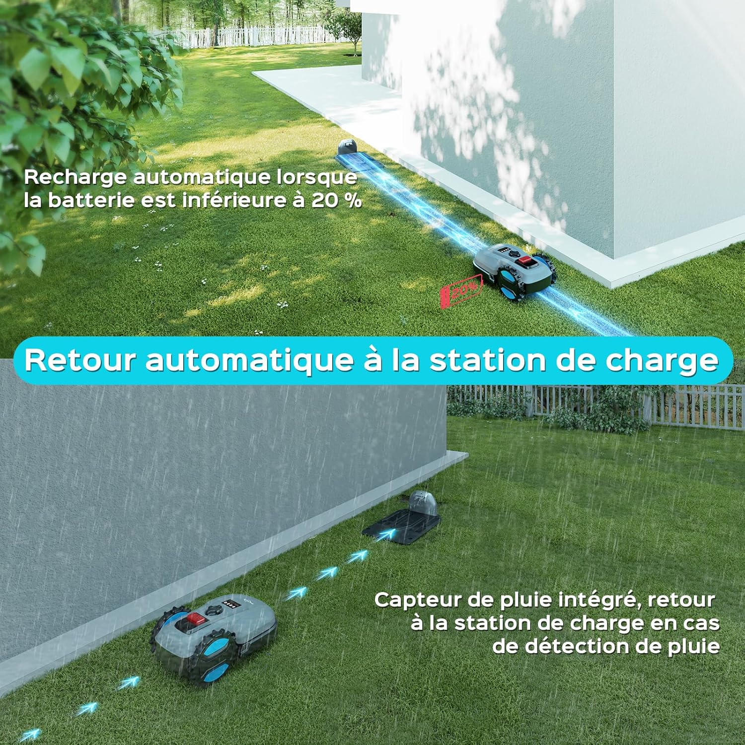 Capteur de pluie et contrôle à distance via application:Le tondeuse robot gazon est équipé d’un capteur de pluie intégré qui arrête automatiquement la coupe dès qu’il commence à pleuvoir, protégeant ainsi la pelouse. Grâce à l’application, vous pouvez programmer les horaires de coupe et contrôler le tondeuse jardin robot à distance, rendant la coupe plus facile, efficace et pratique