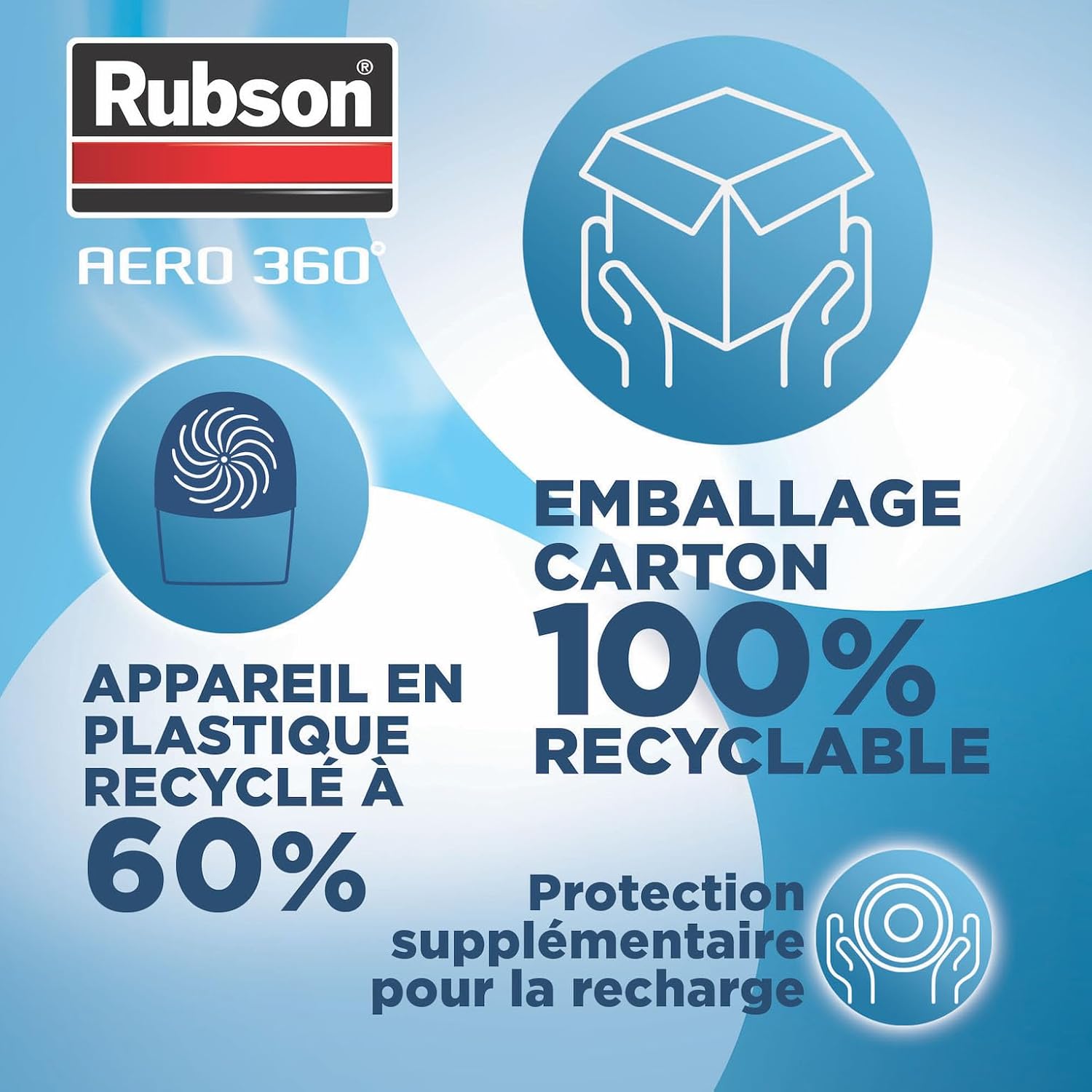 Emballage – Rubson AERO 360° absorbeur d’humidité rechargeable, fabriqué à partir de 60% de plastique recyclé, anti moisissures et odeurs, contient 1 appareil et 1 recharge de 450 g. Emballage renforcé – Plus résistant, spécial envoi Amazon